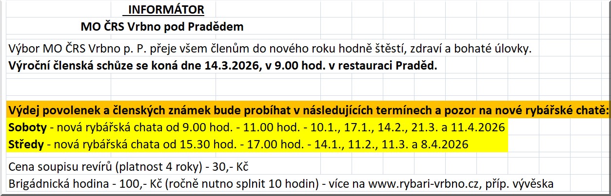 DĚTSKÝ RYBÁŘSKÝ KROUŽEK ZAHAJUJE NOVÝ ŠKOLNÍ ROK 2026 AŽ 2026 V NEDĚLI 14.ZÁŘÍ VE 14HOD - prozatím v budově Tj Sokol Vrbno - na fotbalovém hřišti. Další termíny do konce tohoto roku jsou v záložce DĚTSKÝ KROUŽEK.
